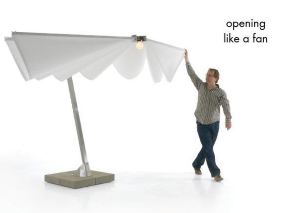 The Kosmos parasol is definitely a typical example of Extremis innovation. As the Kosmos parasol opens and closes as a fan, it is not only very easy to use, but can also be positioned next to the benches and open relatively low. This way everybody can enjoy the shade and an even stronger feeling of intimacy than Kosmos itself already created. Its flat design furthermore guarantees excellent wind resistance.