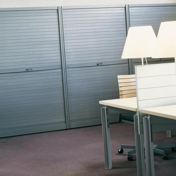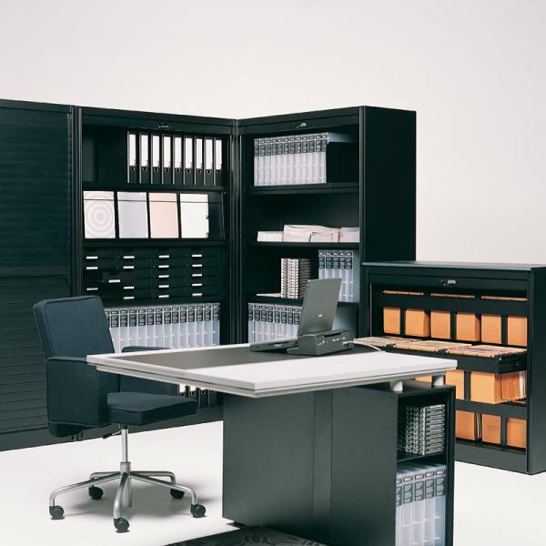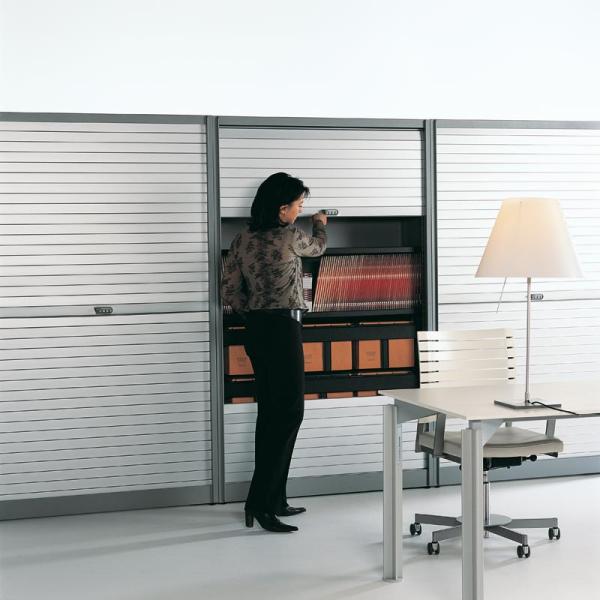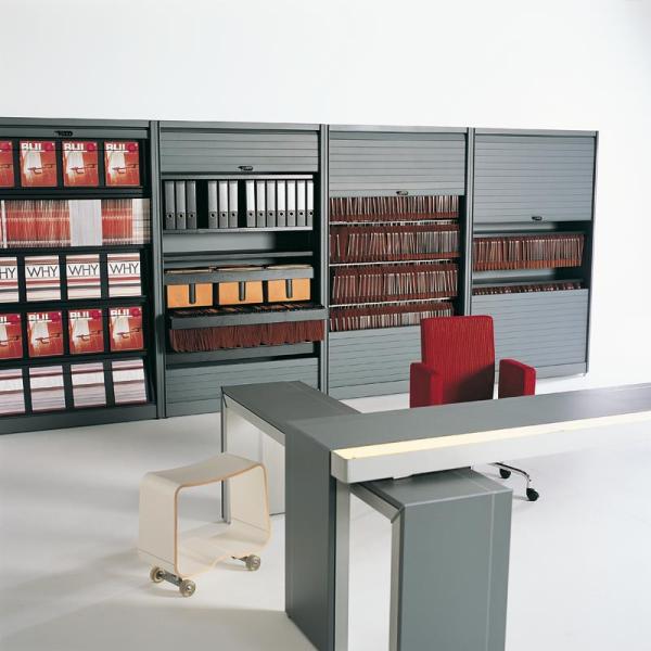 KRS"No office is complete without a reliable and user-friendly filing cabinet. Apart from paper documents and files, modern data carriers such as cd-roms, floppy discs and opticals ask for a well-organised classification system. KRS is Bulo's answer to the need for a modern filing cabinet: a solid closet with roll down shutters that allows for different organisational possibilities and in which space can be maximized. The KRS has many advantages. The synch mechanism allows for both shutters to be opened and closed at the same time, almost silently, while the Bulosafe number lock guarantees a key-less entry and rock solid security. What’s more, the materials offered are pre-determined with extensive use in mind. The backside can also be upholstered, allowing the KRS to be used as a dividing wall or a reception desk."