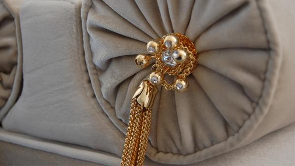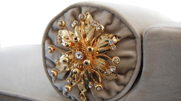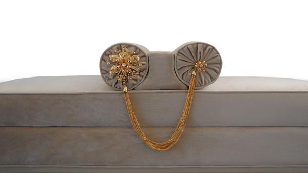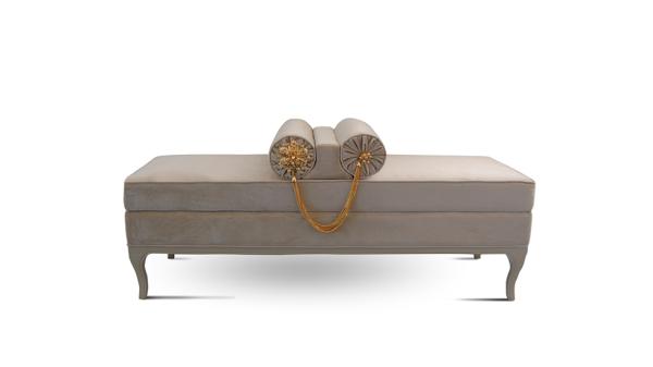 LE-LE | BenchAn affair with luxury. Shown upholstered in a sensuous cream velvet, with a solid wood high-gloss lacquer base and 2 crystal jeweled bolsters.