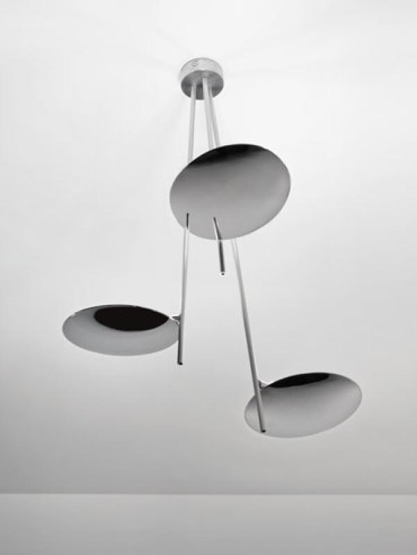 made of metal rods and base,aluminium discs with nickel joint; available in different combinations of colours: black discs, copper or satin rods, black base; discs lined with gold or copper coloured leaf, black rods and base; white discs, gold or satin rods, white base; chrome discs, satin rods and base.