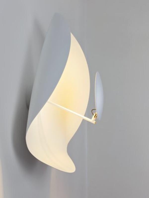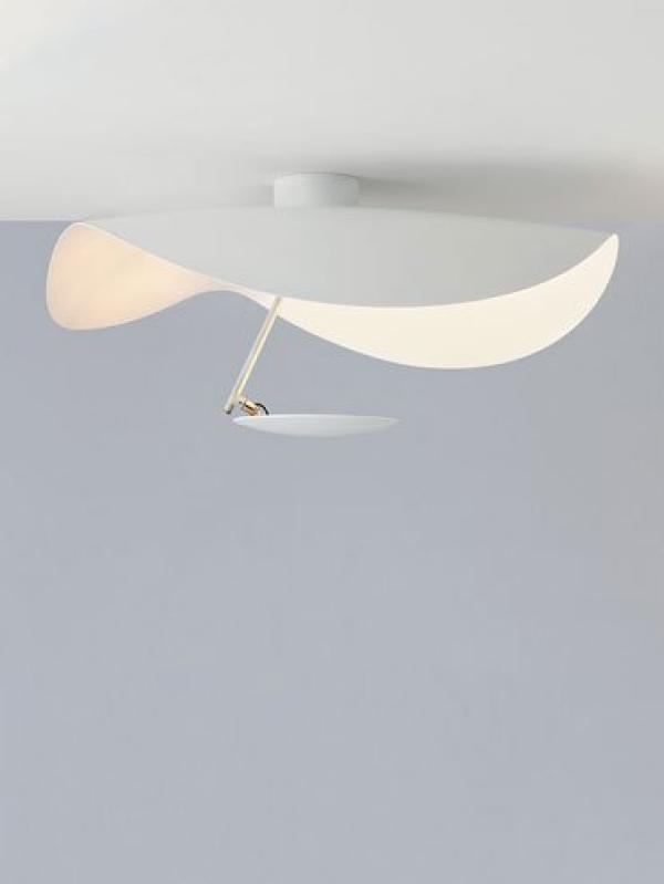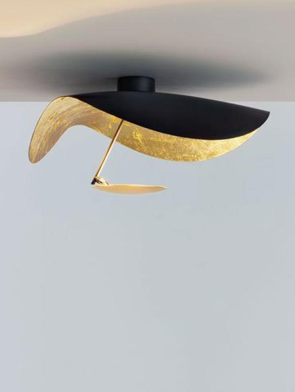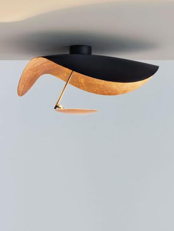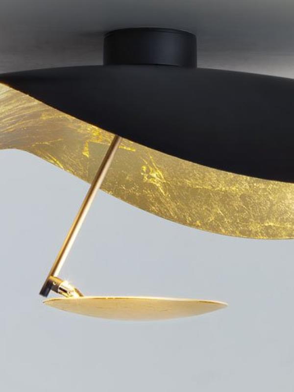 made of aluminium shade, metal rod and aluminium disc with nickel joint. available in different combinations of colours: shade entirely white, white or gold or satin rod, white disc; white shade lined internally with gold coloured leaf, satin rod and white disc; black shade lined internally with gold or copper coloured leaf, black rods, gold or copper coloured disc.