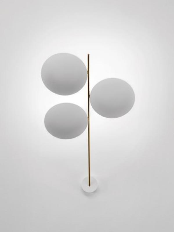 made of metal rod and base, aluminium discs with nickel joint; available in different combinations of colours: black discs, copper or satin rod and black base; discs lined with gold or copper coloured leaf, black rod and base; white discs, gold or satin rod, white base; chrome discs, satin rod and base.