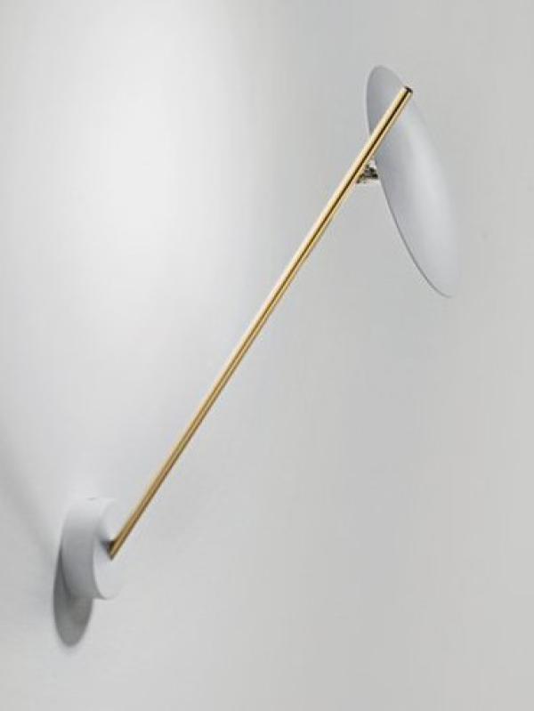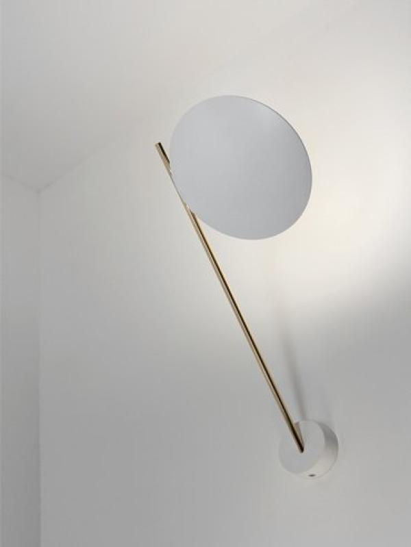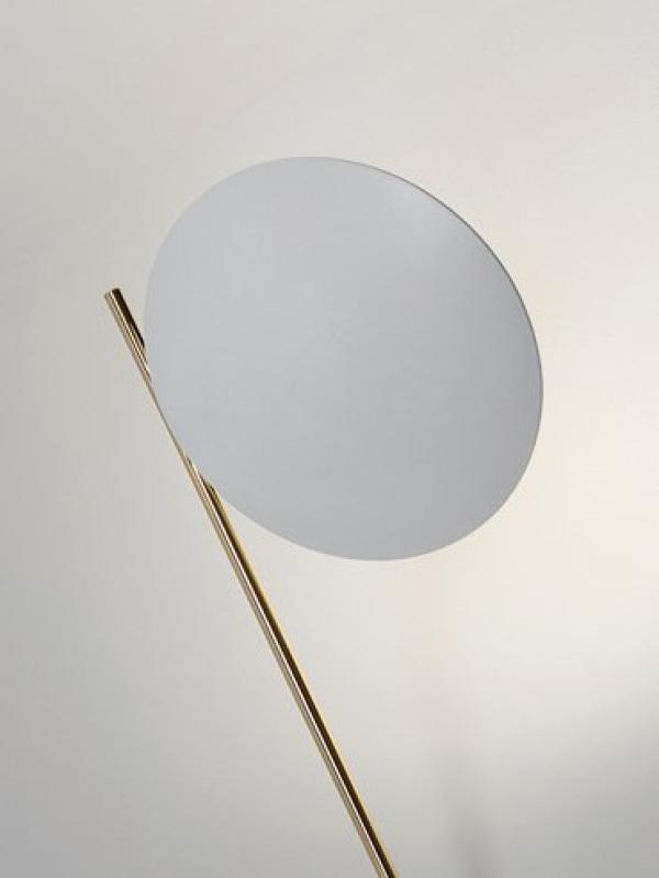 made of metal rod and base, aluminium disc with nickel joint, available in different combinations of colours: black disc, copper or satin rod and black base, disc lined with gold or copper coloured leaf, blackrod and base, white disc, gold or satin rod, white base; chrome disc, satin rod and base