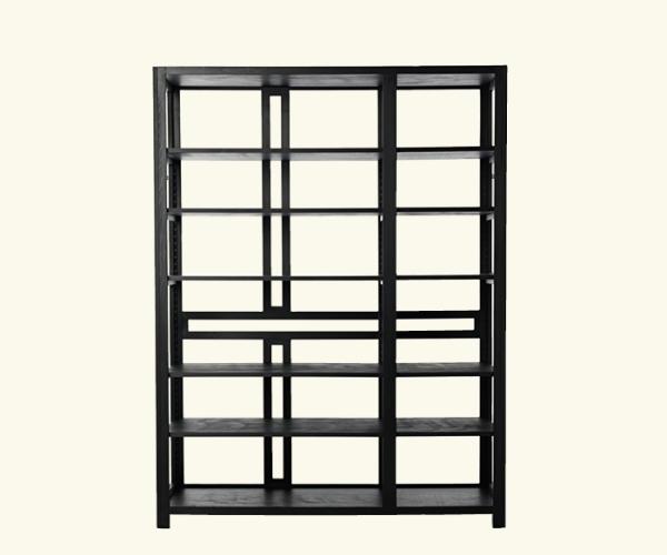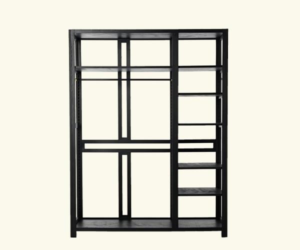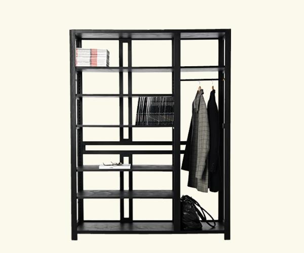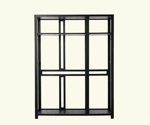 LoloArmoire with open structure in solid exotic wood (origin: equatorial africa) and horizontal and vertical birch plywood panels, painted in black or light gray. Separately available, to complete the product, are large or small birch plywood shelves, painted in black or light gray, with assembly supports in wood and a kit of 2 clothes hanger brass tubes (long and short) painted in black or light gray with brass assembly supports.