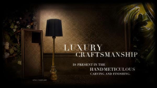 Lotus | Floor LampThe poetic Lotus floor lamp is a dramatically exquisite way to add splendor to any setting. Luxury craftsmanship is present in the meticulous hand carving and finishing of the base. Hand carved wood base, finished in a high gloss translucent color varnish over a silver leaf. Lampshade covered in a low sheen black silk with gold lining.