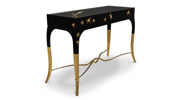 The seduction begins with velvet black lacquered gently applied and coated with an even layer of high gloss varnish bodily covering the edges of the top. It continues as the blackness slithers down to blend with the polished brass.