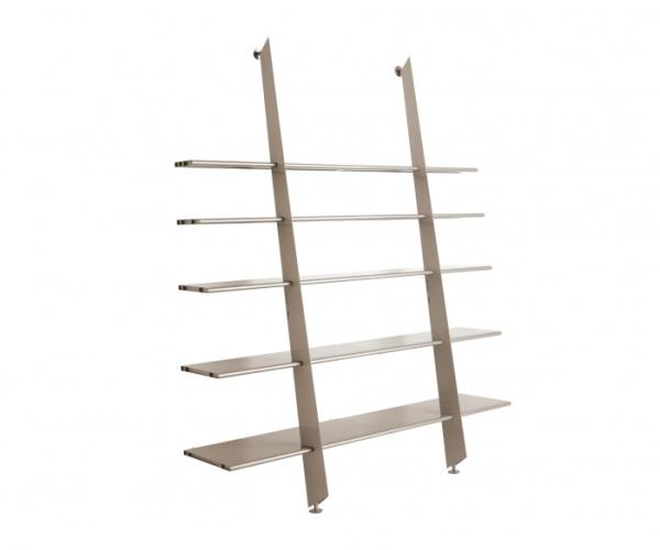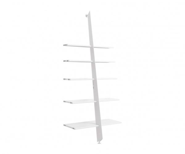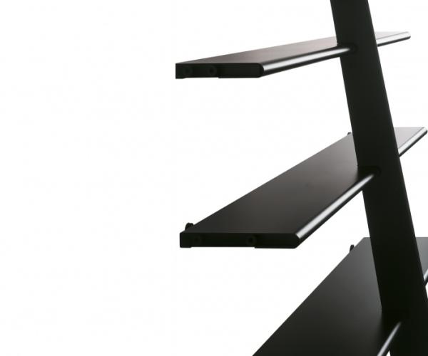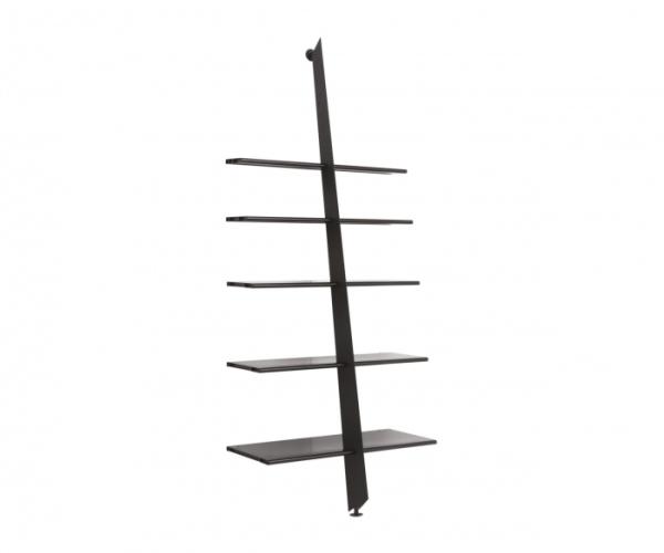 Mac GeeModular bookshelves in steel sheet with epoxy finish in matt black, white and metallic silver. A central upright supports five shelves of decreasing depth. It is designed to create an extended bookcase by lining up two or more units.