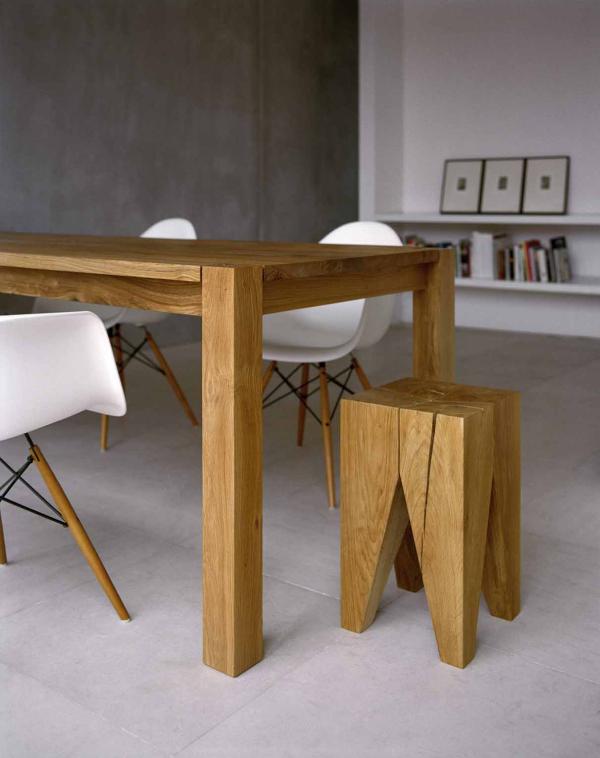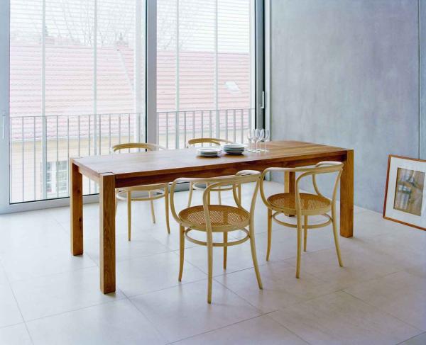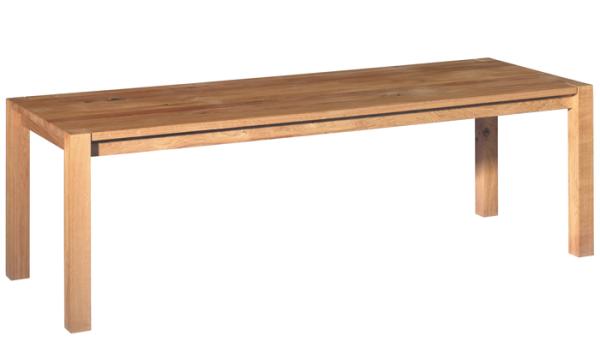 MADAME LILLIEThe table consists of a 30 mm (1 1/8 inch) top firmly screwed to a wooden frame, and two pairs of legs. The square legs measure 80 x 80 mm (3 1/8 x 3 1/8 inch) and intersect with the table top featuring the end grain with its annual rings. As opposed to the table TA04 BIGFOOT TM these legs do not include the centre of the tree and therefore do not show large cracks. Underneath the frame there is a clearance of 650 mm (25 1/2 inch). It is assembled from three parts. |
