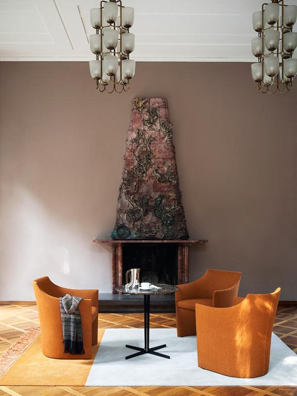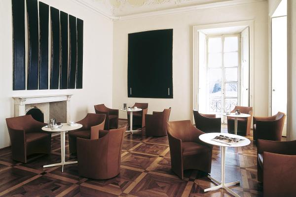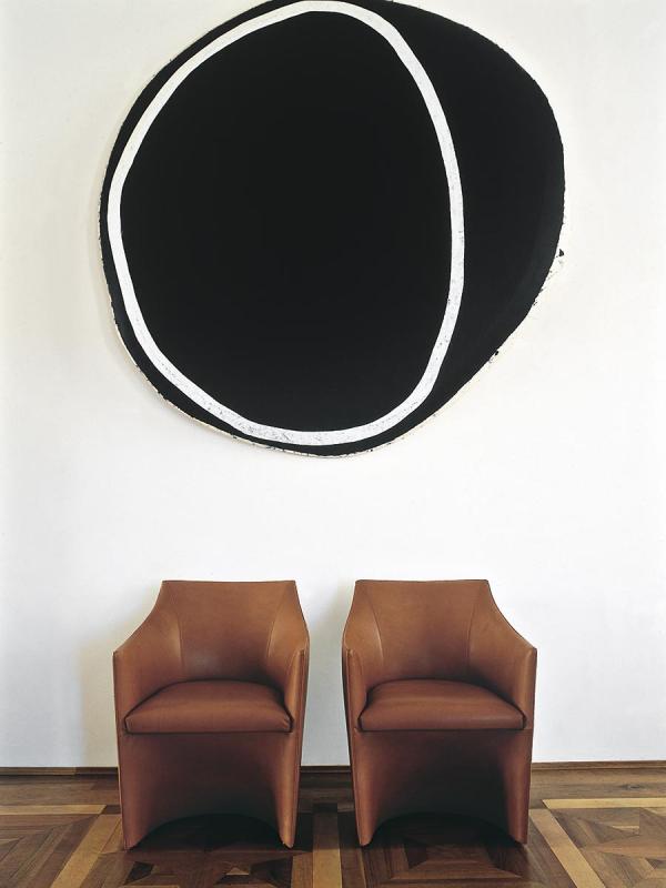 Compact and curvaceous, the Mayfair collection has a unique and distinctive linear aesthetic, like a single curved leaf on the outside, and pleasingly soft in the inside. The easy chair is entirely covered in leather or fabric, and features characteristic visible stitching details that emphasise the curved back.