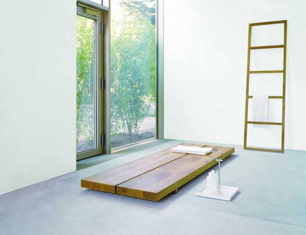 MESAAvailable in two different heights, the plank is made of four 100 mm (4 inch) wide and 60 mm (2 3/8 inch) thick solid wood boards, which are connected together. In the lowest version the wood rests on two 40 x 40 mm (1 5/8 x 1 5/8 inch) thick pieces of squared timber. The higher version requires an additional beam to link the legs. The simple appearance makes an appealing design, emphasizing the solidity and elegance of the material. It works perfectly as low board, coffeetable or as reenergizing areas and substituted with pillows in private areas. |
