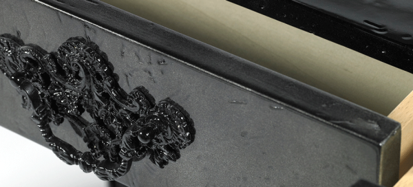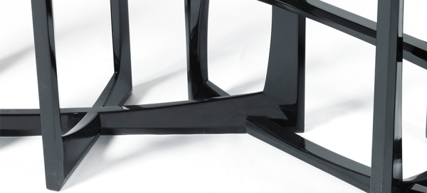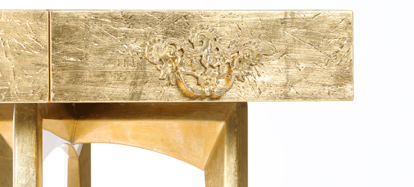 PRODUCT FEATURES : The base is handcrafted from mahogany and the top is framed in particle board which gives the black high gloss lacquer its textured appearance. There are four drawers with delicate brass handles. Dimensions : WIDTH 1400 x DEPTH 400 x HEIGHT 850mm |