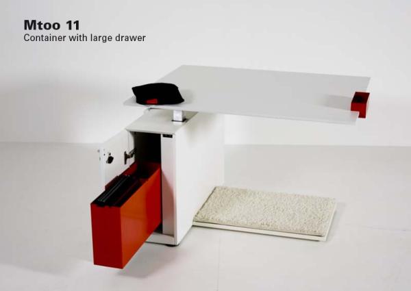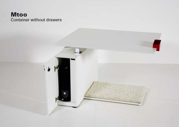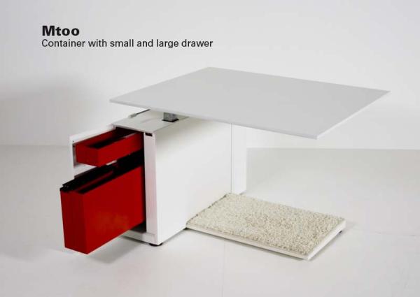 Mtoo"Of all Bulo designs, it is probably the M2 that has gone on to become an icon in the truest sense. Several museums have purchased M2 by dint of its revolutionary concept: in 1996, the 1m2 designed by Luc Vincent and the Bulo Design Team, had been a highly innovative furniture piece. Worldwide, architects lauded the M2 on the merit of its shape and function. M2 is an individual workstation that has been reconceived by the BuloDesigners whilst retaining its basic concept: a drawer unit, a base plate and a floating worktop.