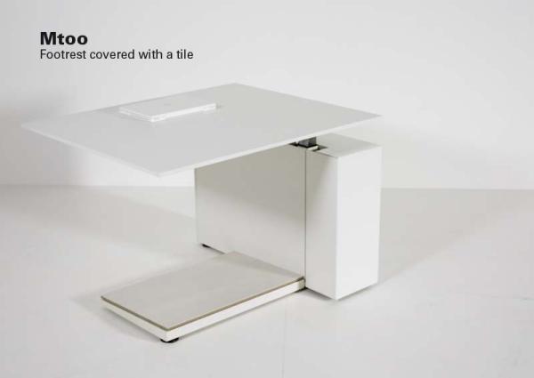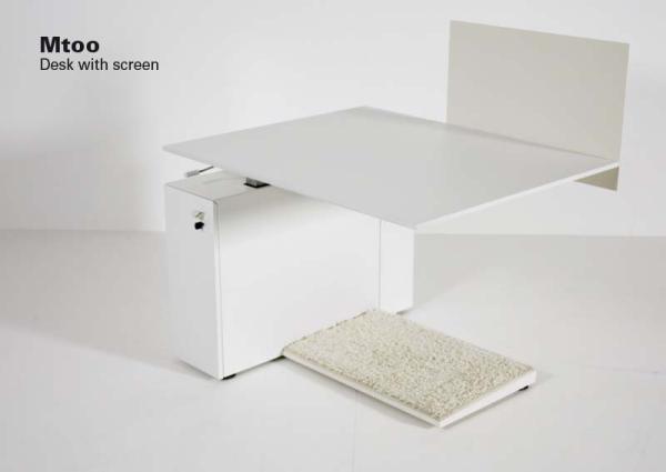 Mtoo retains this qualities as well the square metre concept, be it no longer in a square shape, moving along with IT developments and the fact that ultimately the paperless office has proved to be unfeasible. The biggest innovations in place act in response to the new functions and emotions that are expected from the 21st century desk. ‘New functions’ meaning the M2’s individual height adjustment and the various accessories that serve to facilitate filing and sorting. As to the ‘new emotions’, we are creating an optimum sense of well-being. A carpet by way of a base plate for example allows users to kick off their shoes and work on bare feet, only stimulating their sense of freedom. A vase of flowers or a plant that is nicely integrated helps to reduce stress. Standard, each Mtoo comes with a cushion for a short power nap. Studies have shown a short siesta enhances efficiency, for the employee as well as for the employer. ‘New emotions’ also means refined styling in terms of details and materials used. Mtoo is only available in ‘timeless white’ powder coated MDF and is entirely uni-coloured. This only serves to further underscore the icon quality of the Mtoo, turning the desk into an architectural object. Mtoo places the individual centre stage, reflecting the ‘Love your office –Back to work’ philosophy."