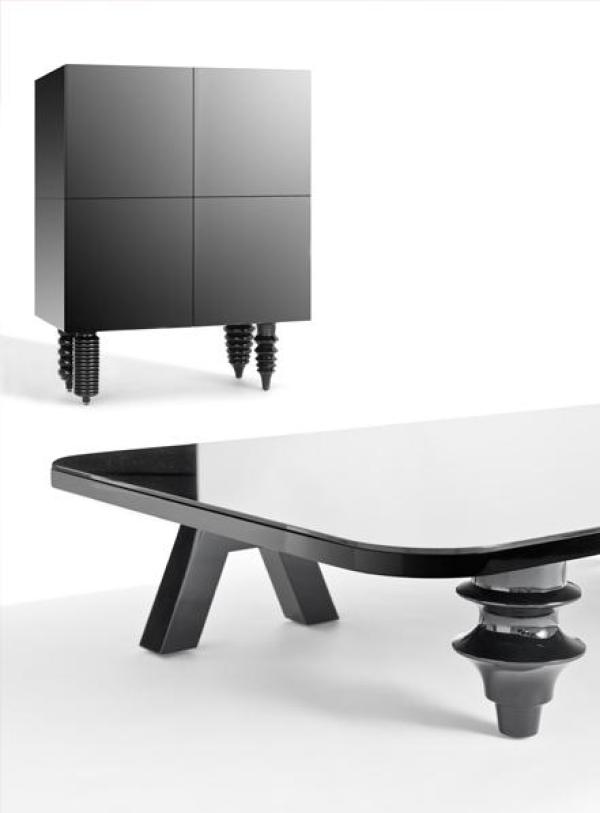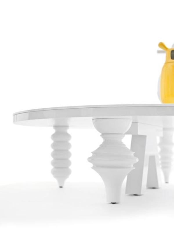 Multileg Low TableBase in MDF. Glass top of 8 mm lacquered on the bottom. Legs in turned alderwood. Available lacquered high gloss in white, grey, red, aubergine, blue and black or laquered matt in red, grey, aubergine, blue and green. Launch : 2011