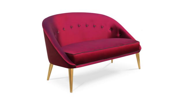 Nessa | SofaClassic in its silhouette, the lustrous curves of this sofa complement those of the modern day woman. High gloss varnish reveals the many hues of the sultry satin being draped and adorned. Detailed stitching trails along the edges leading down a path to solid wood legs elegantly finished in gold leaf.