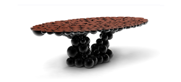 Newton Black WalnutWe are still working hard on new challenges for artisans and designers; new techniques, materials and concepts are still being tested now it’s a “MOMENTUM”. Newton is our truly moment of inspiration, a table completed by spheres and semi spheres that joined together complete this dining table with this exquisite look. Inspired in Newton’s law of gravity, we were looking for an object capable to reflect the sphere attraction as they were joined with their mass, force and energy. This table is ideal for 8 to 10 people who will be amazed when gracing this masterpiece at your home. Techniques as casting, lacquering or varnishing, are used in this table, with materials as myrtle burl veneer, walnut root veneer and aluminum. This table has three different versions and all of them present amazing different combinations. Black Walnut Black lacquer aluminum spheres finished with high gloss varnish on the base and the top it’s made with walnut root veneer finished with high gloss varnish. Dimensions : WIDTH 2600 x DEPTH 1420 x HEIGHT 780mm |