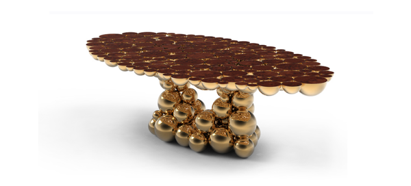 Newton Gold MyrtleWe are still working hard on new challenges for artisans and designers; new techniques, materials and concepts are still being tested now it’s a “MOMENTUM”. Newton is our truly moment of inspiration, a table completed by spheres and semi spheres that joined together complete this dining table with this exquisite look. Inspired in Newton’s law of gravity, we were looking for an object capable to reflect the sphere attraction as they were joined with their mass, force and energy. This table is ideal for 8 to 10 people who will be amazed when gracing this masterpiece at your home. Techniques as casting, lacquering or varnishing, are used in this table, with materials as myrtle burl veneer, walnut root veneer and aluminum. This table has three different versions and all of them present amazing different combinations. Gold Myrtle Version Gold plated aluminum spheres finished with high gloss varnish on the base and a top made by an amazing myrtle burl veneer, finished with a high gloss varnish. Dimensions : WIDTH 2600 x DEPTH 1420 x HEIGHT 780mm |