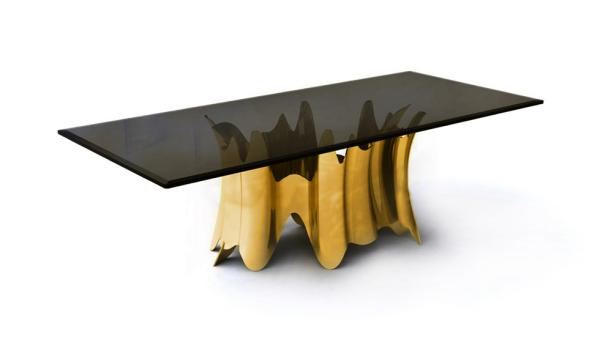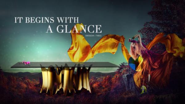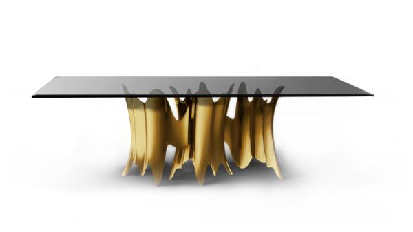 Obssedia | Dining TableInitially it is a table. Then it becomes a table cut from clear glass, the top slightly smoked in bronze. Your eyes begin to wander down, drinking in the rhythmic design of the base, following every gold crevice leading down only to head back up; compelling you to continue staring. Soon enough, the simplicity of the table disappears, leaving only an intoxicating illusion of art coming to life.