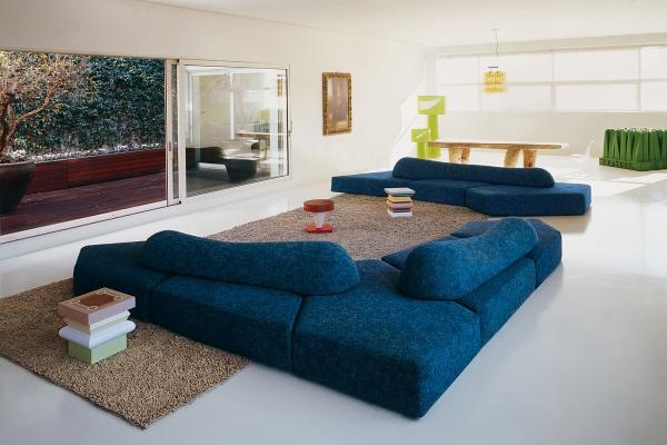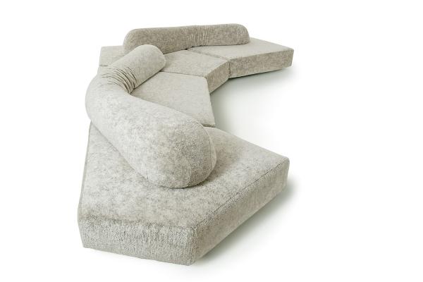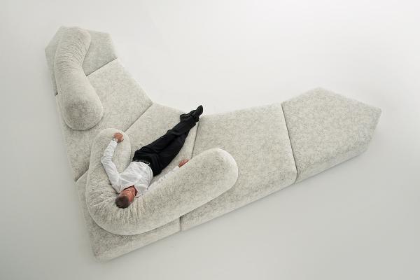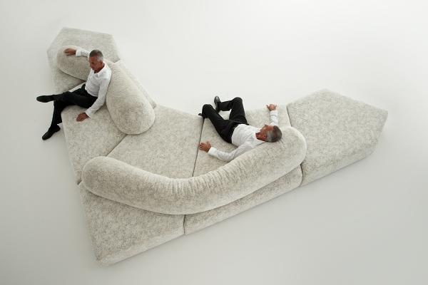 Composed of four irregularly shaped, independent elements, three polygons and a quadrilateral, on moulded polypropylene and rubber feet. The elements can be placed together along the various sides to obtain myriad patterns with modularity, governed by the laws of plane geometry, multiplied exponentially. The shapes, without frame and any rigid support, are modelled by hand with a mixture of Gellyfoam® and other foams, protected by an international Launch : 2004 Dimensions :