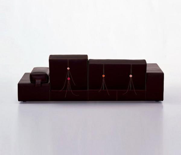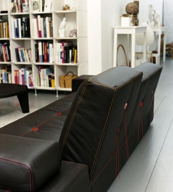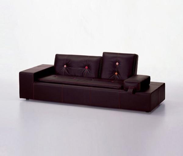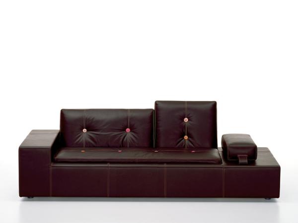 In the leather version of the Polder Sofa, the composition of the fabric sofa is changed in various ways. For versions with dark brown nappa leather covers throughout, the multicolour principle is applied to the buttons and quilted seams – either vibrantly and expressively in bright reds and oranges, or neutrally in discreet natural colour tones. By contrast, in an elegant white version the Polder Sofa boasts a composition of different qualities of leather in fine-tuned whites, emphasised by white mother of pearl buttons and turquoise seams. With a classic, luxurious leather covers and striking details, the Polder Sofa combines eternal values with a fresh contemporary touch.