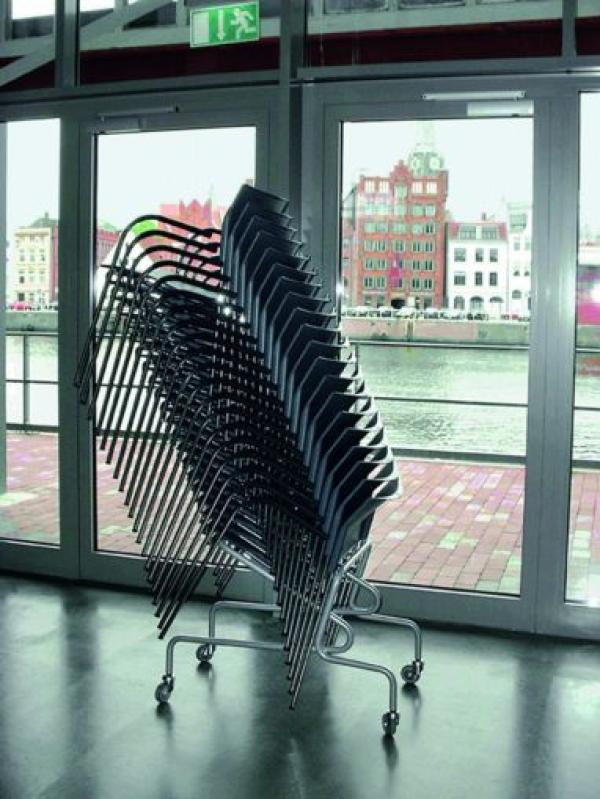 "Used by the thousands and successfully tested under the toughest conditions, these chairs can be found in trade fair halls, event halls, museums, churches, town halls and cafeterias. They fulfill the requirements of mass seating: they can be stacked, easily connected, are easy to take care of and are very comfortable. The clever row connection (Thonet patent) makes them additionally special. The frames are connected without any extra parts. This system offers two economical advantages: the comfortable chair width of 58 cm has a row axis dimension of only 53 cm. Several chairs can thus be placed on a surface and handling the chairs is so simple that assembly and disassembly times are clearly reduced. |