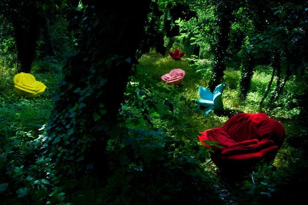 Rose ChairRose-shaped, it can be seen as a haute couture item. The petals, which form the padding and make the seat welcoming, are hand made one by one. The frame is in moulded metal with small parts in shaped wood. The filling is in polyurethane foam and Dacron and the legs are in turned and brushed aluminum with a kiln-dried transparent finish coating. The upholstery is in velvet in the colours available in the fabric collection. Launch : 1990 Dimensions : w900 x d820 x h800mm |