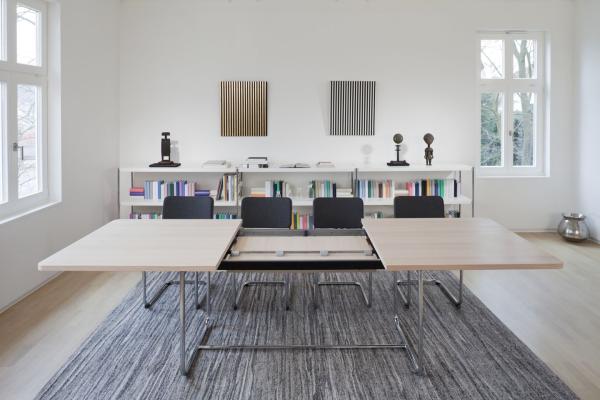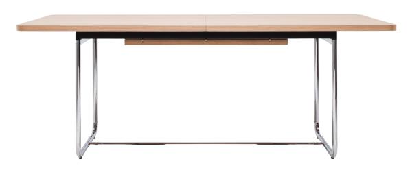 S 1070A classic table with special details A classic table with special details. The filigree, elegantly curved tubular steel frame is combined with a simple wooden tabletop. The tabletops of models S 1071 and S 1072 can be extended with panels in different sizes. Due to their formal reduction and selection of different surfaces, these tables can be used in residential homes as well as meeting rooms. Tubular steel frame chrome-plated, lacquered or nickel-plated, tabletop solid oak or walnut, oiled or ThonetDur. Model S 1070 is available in the ThonetDur® version only, S 1072 is also available with solid oak or walnut tabletop oiled, with HPL coated panel in the color “chocolate”. S 1070. Tabletop 200/220/240 x 100 cm. The tabletops have a thickness of 30 mm. S 1071. Tabletop 200 x90 cm, can be manually extended by 40 or 80 cm with the two panels inserted in the table. The tabletop is doubled to 60 mm. S 1072. Tabletop 200x100 cm. With the easy-to-handle folding mechanism the two integrated extension panels can be folded out with one hand, resulting in a table size of 290 x 100 cm. The integrated extension panels are cross-veneered or HPL coated in the color “chocolate”. Tabletop thickness 60 or 30 mm, the thinner version is available with rounded corners. |