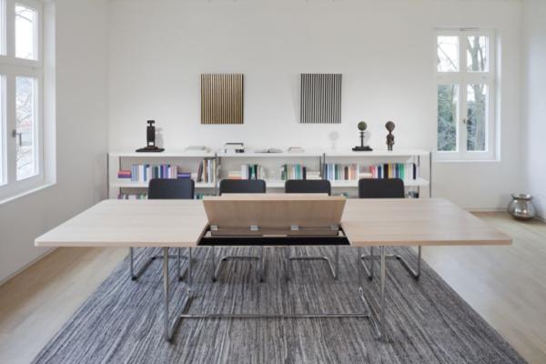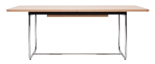 S 1072"VERSATILE, GENEROUS, EXTENSIBLE: THE S 1072 TABLE A classic table with special details. The filigree, elegantly curved tubular steel base frame is combined with a simple wooden tabletop. Both programs include the extension of the tabletops in various sizes. Due to the formal reduction and the large selection of different surfaces these tables are fit for homes as well as meeting rooms. Tubular steel frame chrome-plated or powder-coated, tabletop veneered with beech, ash, maple, black cherry, oak, nut, or with top coat. S 1071. The basic size of the tabletop of 200 x 90 cm can be manually extended by 40 or 80 cm with the two insert panels. The tabletops have a thickness of 60 mm. S 1072. Tabletop 200 x 100 cm. With the easy-to-operate folding mechanism the two integrated extension panels can be folded out with one hand, resulting in a table size of 290 x 100 cm. The integrated extension panels are cross-veneered. Tabletop thickness 60 or 30 mm, the thinner tabletop is also available with rounded corners." |