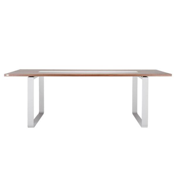 "Formal reduction and an almost classical design: these skid tables are suitable for homes, offices, meeting and conference rooms. The wooden tabletops form a strong contrast with the elegantly curved, chrome-plated skids. |