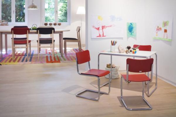 S 143 K"TUBULAR STEEL CLASSICS S 43 - AN EXEMPLARY DESIGN IN THE SPIRIT OF MODERNISM In all of his furniture designs Mart Stam relied on straightforward forms, an aesthetic economy of means in the construction and the benefit of improved sitting comfort. In the case of S 43 he combined the tubular steel frame with molded plywood shells for seat and back and thus created an absolute reduction. Due to the comfortable flexing effect of the frame, upholstery is unnecessary. Its clear, reserved form makes this cantilever chair an exemplary design in the spirit of modernism. Today, Thonet owns the artistic copyright for this strictly cubic chair without back legs. Without or with armrests. Tubular chrome-plate steel, also stackable. Moulded plywood seat and backrest in beech stained, lacquered and texture finish in 11colors. Also available with upholstered wood shells, covered with leather or fabric." |