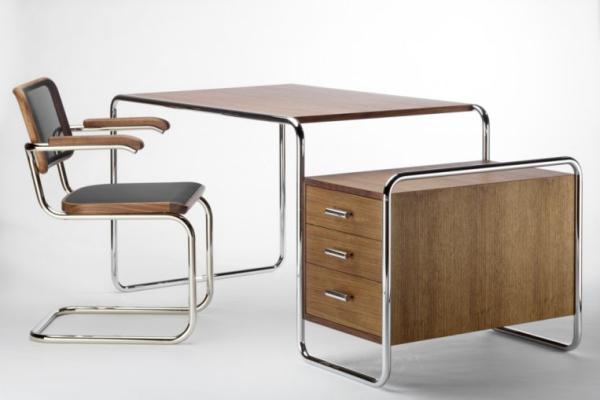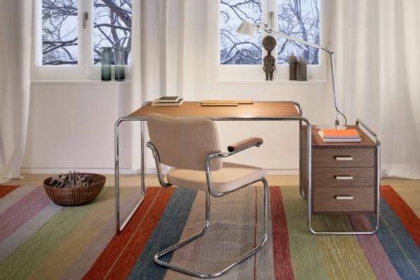 S 285"THE TUBULAR STEEL DESK S 285: AN UNSURPASSED PIECE OF MODERN DESIGN This tubular steel desk is a successful example of the Bauhaus' programmatic claim of combining art and technology into a formal unit. The tabletop and storage elements made of varnished or stained wood harmonically fit in with the tubular steel design. The supporting frame consists of a single line; the wooden elements seem to float in it. The simple piece of furniture, which is formally balanced in its proportions, represents an expressive piece of contemporary history known as ""The New Objectivity."" We produce various versions of this model. Frame chrome-plated tubular steel, body in stained oak and ash, ash open pore lacquer or body lacquered in various colors. Drawers lockable with central lock. Also available as a version with open shelf compartments or in a ""Pure Materials"" version with oiled walnut veneer. Current product changes: - We have equipped the desk's drawers with a self-closing drawer track. Due to the increased size of the track, the arrangement and number of drawers has therefore changed.