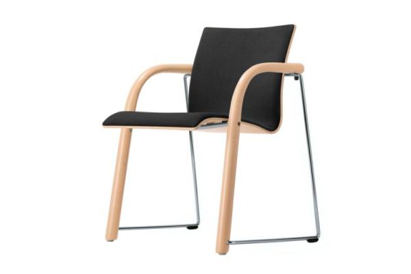 S 320"SINCE ITS CREATION IT HAS BEEN USED IN NUMEROUS SEMI-PUBLIC BUILDINGS The S 320 combines the typical Thonet materials, wood and tubular steel, to create a comfortable and elegant upholstered chair. Since its creation it has been used in numerous semi-public buildings, especially public and private event rooms. The front legs are made of solid beech wood bent in the traditional way; they are connected with a tubular steel frame. The ergonomically shaped seat shell fits into this basic construction. It is upholstered and can be covered with leather or fabric. For the semi-public sector the chair is stackable, can be connected with an additional element, and can be equipped with a writing panel. With armrests. Frame made of solid stained beech wood or with cover varnish, and tubular steel chrome-plated or powder-coated. Molded plywood shell in stained beech or with cover varnish. Partial upholstery covered with leather or fabric." |
