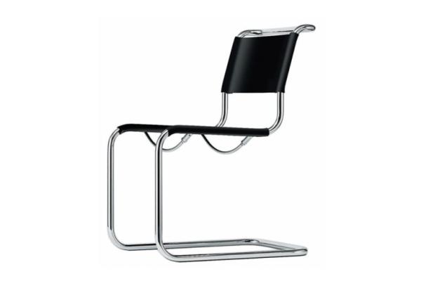 S 33 / S 34"A MASTERPIECE FROM 1926: THE S 33 AND S 34 BY MART STAM These chairs are the first cantilever chairs in furniture history. They were used for the first time in 1927 in the Weissenhof-Siedlung in Stuttgart. Starting in 1925, Mart Stam experimented with gas pipes that he connected with flanges and developed the principle of cantilevering chairs that no longer rest on four legs. He thus created a construction principle that became an important building block in the history of modern furniture design with its formal reservation. In the beginning, Stam was not yet focused on the flexing effect of the bent tubular steel; rather, he was interest in the clear form, which perfectly fit in with the modern buildings of the time. Without (S 33) or with armrests (S 34). Frame chrome-plated tubular steel. Stretched with butt leather or plastic mesh in black or silver. Armrests in solid beech or black elastomer." |