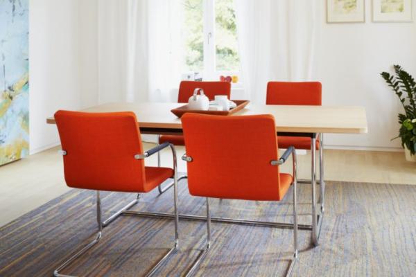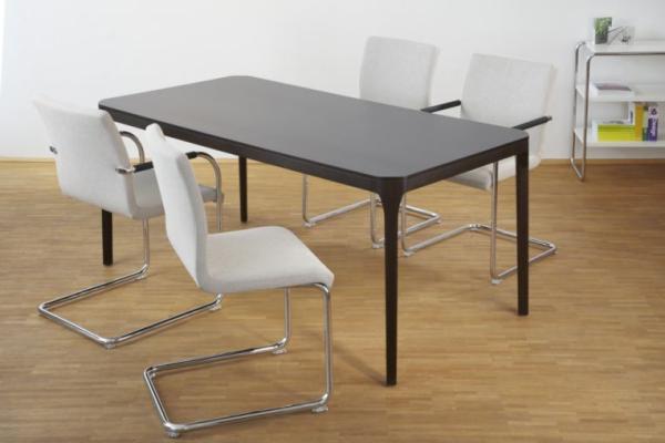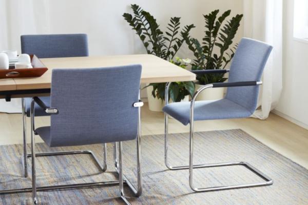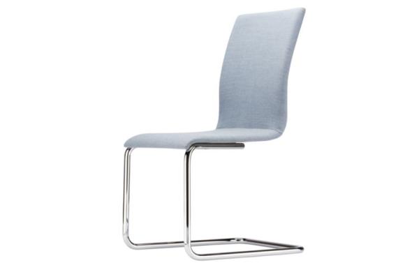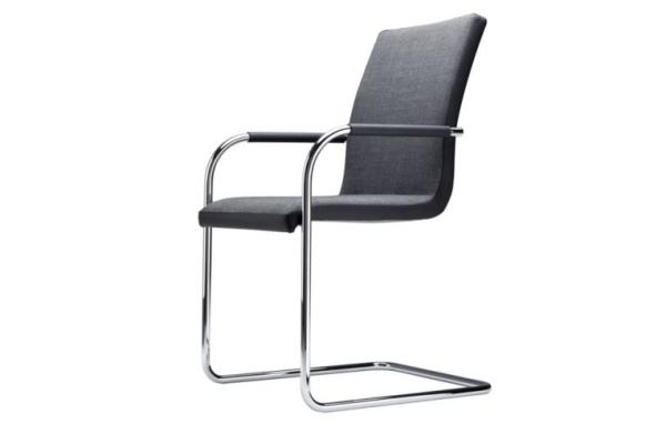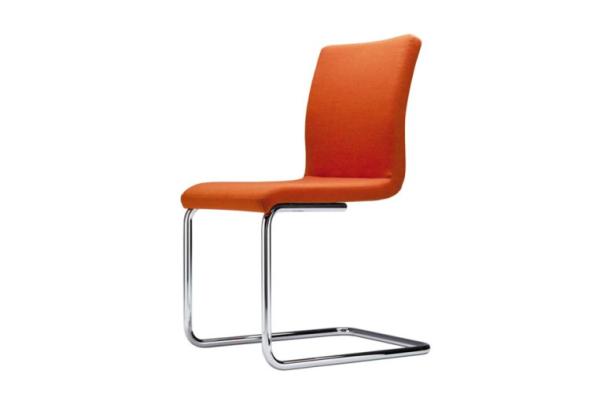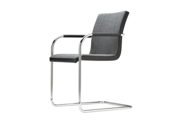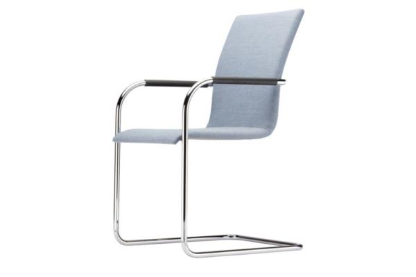 S 55"CLASSIC AND COMFORTABLE: THE S 55 CANTILEVER CHAIR SERIES A comfortable and elegant all-rounder, based on the construction principle of the cantilever chair. With its one-piece seat shell it offers the highest possible comfort, has a formally clear design and is produced in the typically high Thonet quality. Its area of uses ranges from conference and meeting rooms to training and seminar rooms and to the living segment. The model is produced with and without armrests, with two different backrest heights, with two upholstery thicknesses and also as a stackable version. Frame chrome-plated tubular steel, seat made of molded plywood, fully upholstered. Cushions made of cold foam; seat 35 mm, backrest 30 mm (S 55 PV) or cushions made of polyether foam, seat 15 mm, backrest 15 mm (S 55 P). Armrests made of black elastomer or covered with nappa leather. Covers in leather or fabric." |