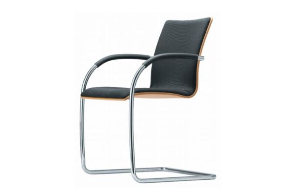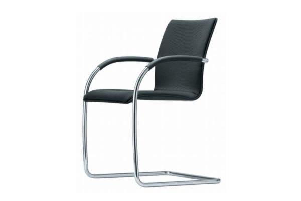 S 81"CANTILEVER CHAIR S 81 FOR THE CONFERENCE AND MEETING SEGMENT OFFERS HIGH SITTING COMFORT AND CLEAR AND RESERVED DESIGN The chair typology of the tubular steel cantilever chair has been closely connected with Thonet since its invention by Mart Stam in the 1930s. A number of models that are especially suitable for the conference and meeting segment stem from this tradition. They all have in common the high sitting comfort, the clear reserved design and high quality. The chairs of program S 81 have an elegantly curved tubular steel frame with a comfortable seat shell: with regular or high backrest, with partial upholstery or fully upholstered. All models are also available in a stackable version. With armrests. Base frames chrome-plated tubular steel. Armrests made of elastomeric plastic or nappa leather. Seat and backrest made of a single molded plywood shell with partial upholstery or fully upholstered and covered with leather or fabric." |