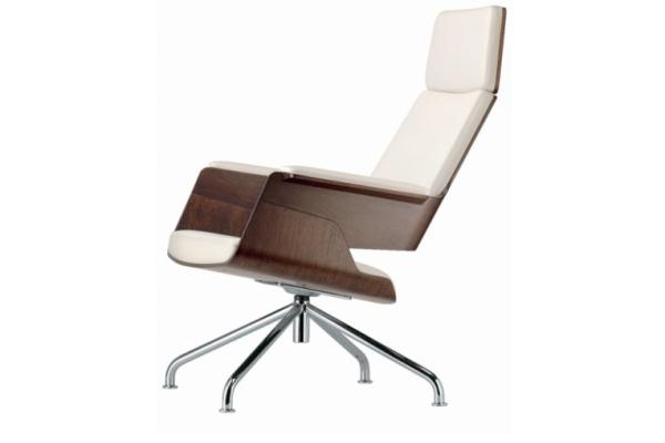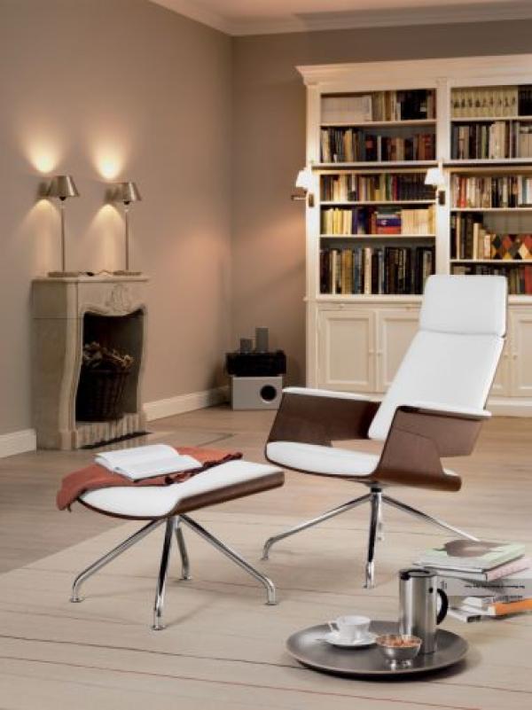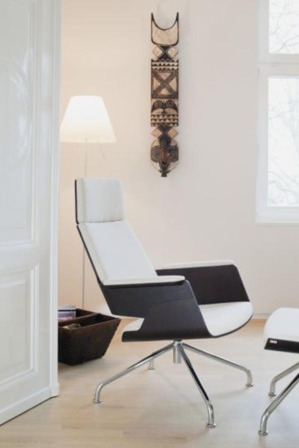 S 850"ARMCHAIR S 850: MAXIMUM COMFORT, MAXIMUM ELEGANCE The generously dimensioned armchair with matching ottoman recommends itself as a comfortable and elegant resting place in the living and semi-public sectors. Its comfort is due to the ergonomically shaped seat and backrest shell with a matching upholstered cushion. Its formal and constructive characteristic is the accentuated separation of frame and seat shell. The perfectly harmonic interaction between supporting lines and enclosing surfaces communicates a warm, vivid look and feel that is additionally enhanced through the use of fine wood and tubular steel, the typical Thonet materials. The result is a clear, elegant silhouette combined with the best possible seating comfort. Frames chrome plated tubular steel. Seat shell and ottoman shell made of molded plywood, veneered on both sides with stained oak. Comfortable cushion covered with leather or fabric. The swivel armchair has a return mechanism that automatically turns the seat to its original position." |