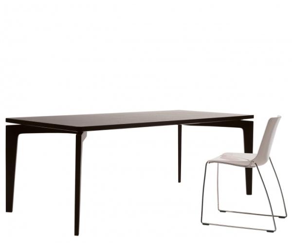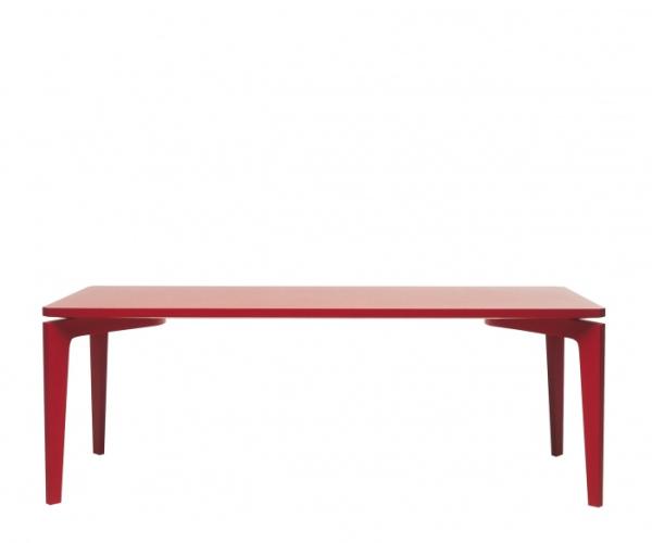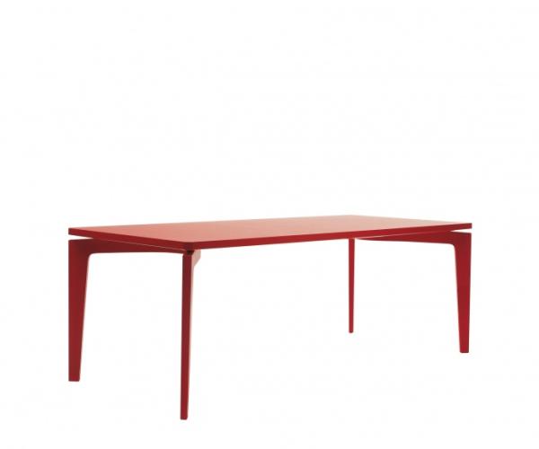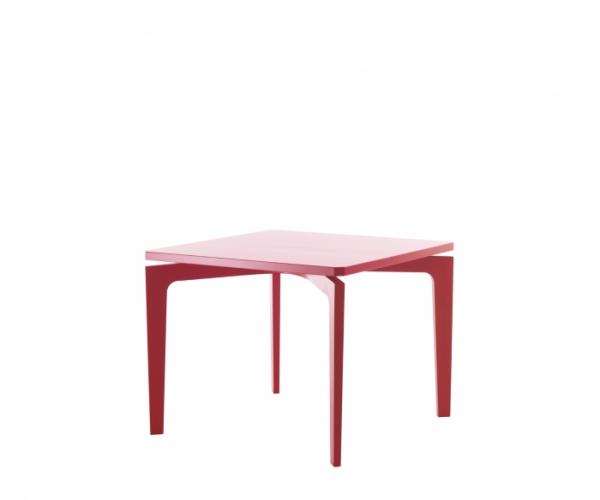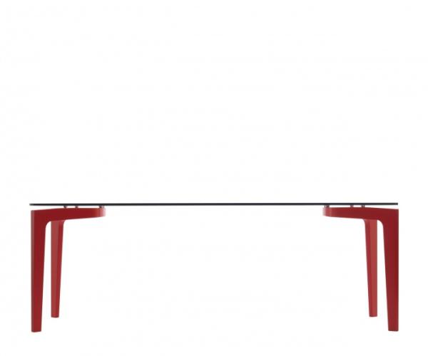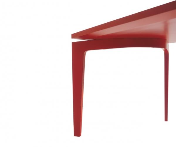 SamTable with double-portal solid wood supporting base, attached directly to the top to form a single carrying structure that does not require additional support elements. Sam is available in four sizes, in natural ash wood lacquered in white, red or black with top in MDF in the same finish or in 15mm tempered glass. NB the glass top is not available in the size 90x90cm.