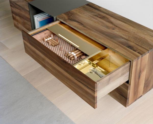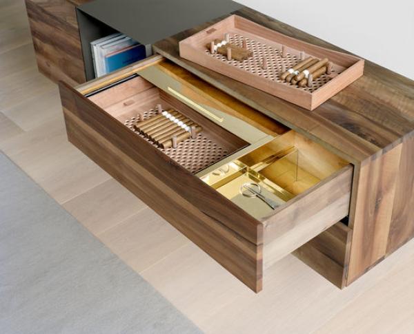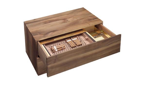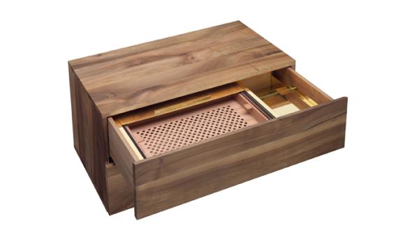 SB12 MARTOUBThe humidor SB12 MARTOUB is a particularly precious piece. Designed as a complementing module for the solid wood sideboard SB08 MAHNAZ, with its refined interior, SB12 MARTOUB is mounted in one of the drawers offering space for up to 150 cigars. Necessary for the cigars’ correct climate and aroma control, SB12 MARTOUB has an interior in Spanish cedar wood. A movable top in polished brass or stainless steel ensures a contained environment. SB12 MARTOUB is delivered with an inbuilt hydrocase, an electrically regulated humidifier to regulate the relative humidity within the MARTOUB to 70%. Next to the humidor, a sliding and removable tray also in polished brass or stainless steel allows for essential utensils to be glamorously stored. |