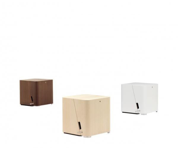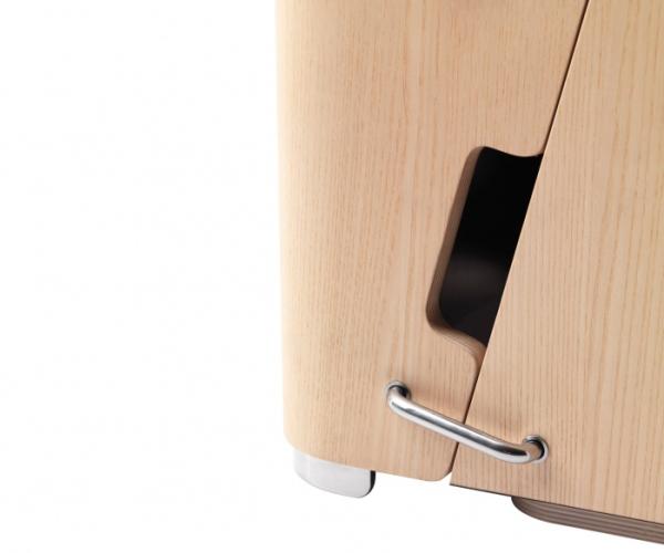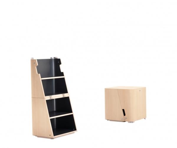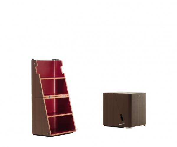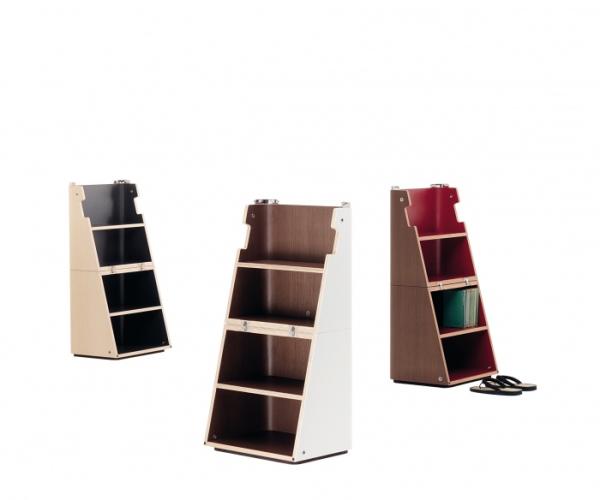 ScaloSidetable/stool convertible into a step ladder/small bookshelf through the movement of hidden hinges. Scalo is made of bent plywood in natural ash colour with laminated lead-gray interior, in moka ash colour with laminated red interior or in white lacquered with moka ash wood interior. A stainless steel stop securely locks Scalo in both configuration for a safe use.