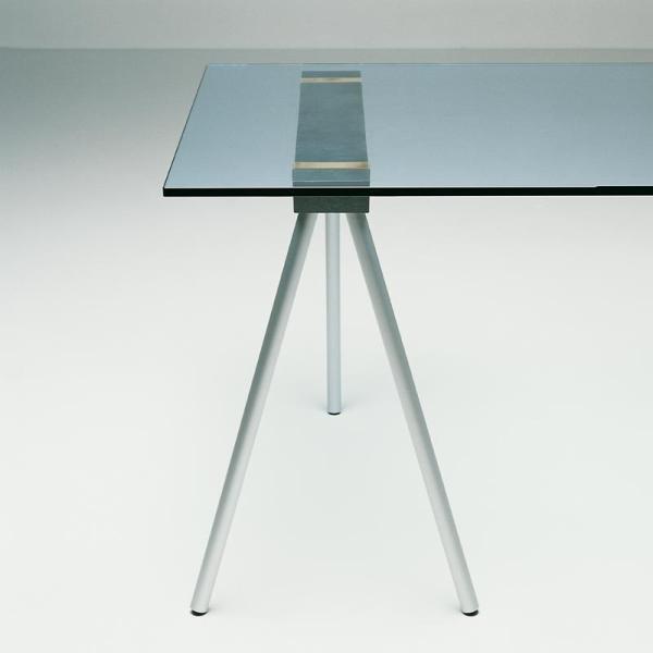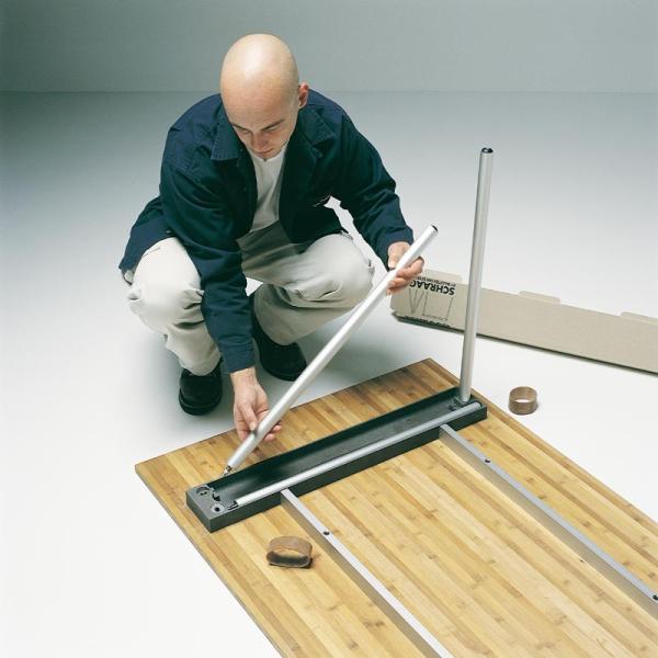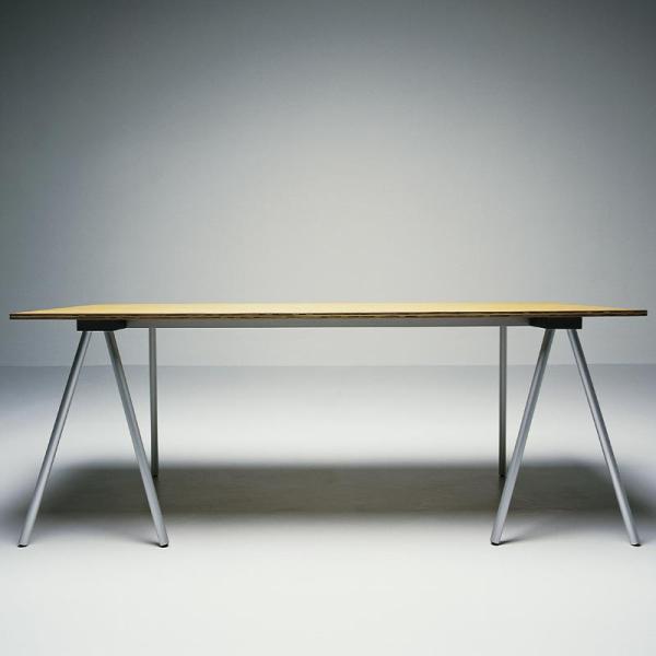 Schraag"‘SCHRAAG’ is an up-to-date interpretation of the ‘trestle’concept: a flexible and compact support with three (not four) slender aluminium legs. One leg stands vertical while the other two are inclined enhancing stability. The legs are screwed into an aluminium support. The rubber strips prevent the top from sliding off. It is quite easy to detach the legs and to hide them in the supporting element, which can then serve as a portable case. The rubber strip prevents the legs from falling out of the case.