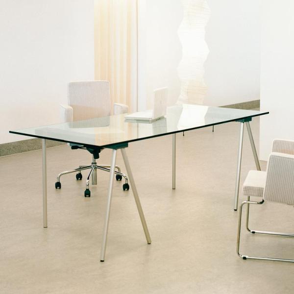 The worktop can be chosen freely. As standard worktop Bulo proposes a top with a width of 2 meters and a depth of 90 cm in 3 versions: oiled bamboo, bright glass or red coloured multiplex. The multiplex version is also available with a top with a length of 3 meters. Thanks to its ‘compactness’ SCHRAAG offers a whole range of possibilities. At home it can be used as a mobile desk travelling between the house in town and the apartment at the seaside or as a table for garden parties. But also the business world demands more and more mobile and uncomplicated solutions. "