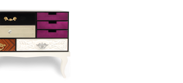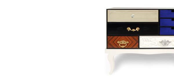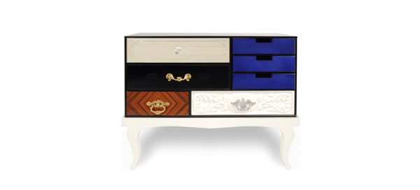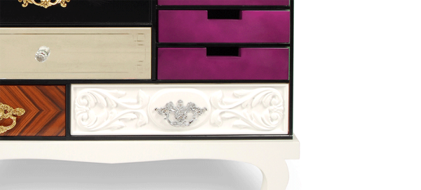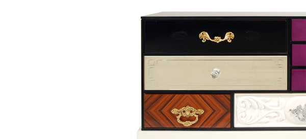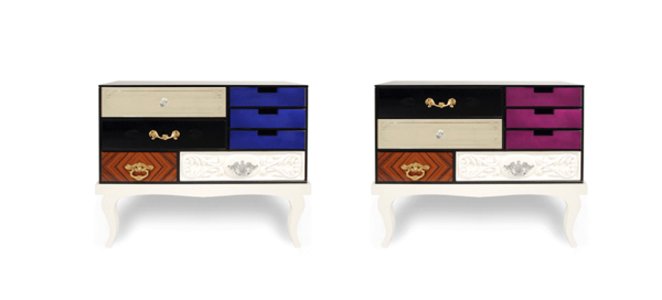 Soho Bedside TableSoho Bedside Table is another addition to Soho Collection. Composed by a collection of wood drawers finished in mirror and black glass with etched detailing, gold leaf, diamond mateched rosewood veneer, high gloss blue or pink lacquer, and white lacquer with hand carved relief patterning. The drawers are accented with handmade brass pulls, some of which are plated in chrome, and cut glass knobs; they are encased in a bronze glass box supported by a high gloss.