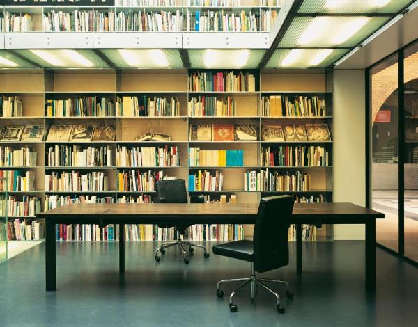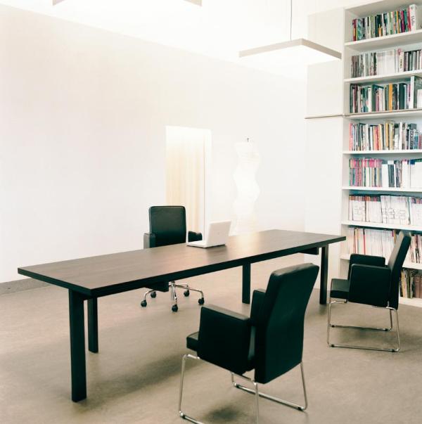 "Spine, a table redefining construction and form. The top showing the construction of the support. The legs are dissymmetrically placed; one leg on each short side and two legs on one wide side, thus leaving the other wide side free of legs.