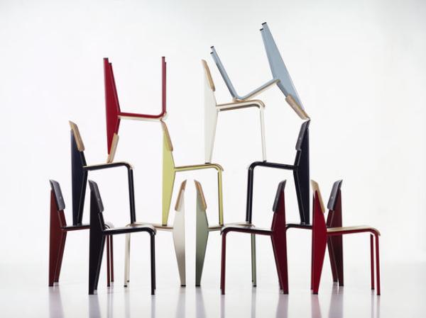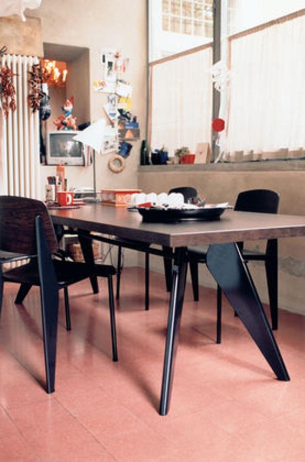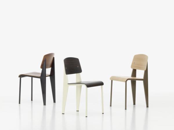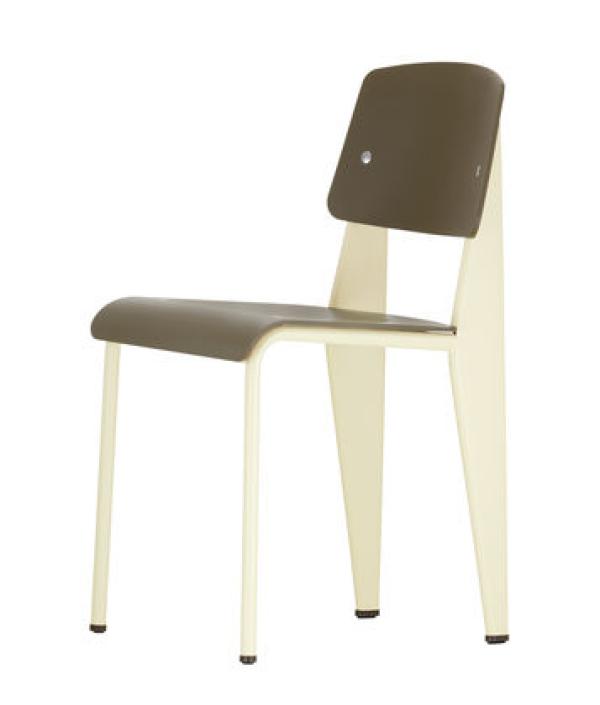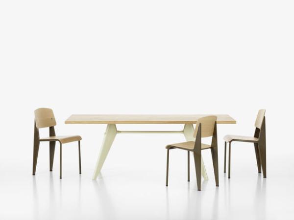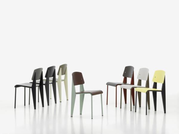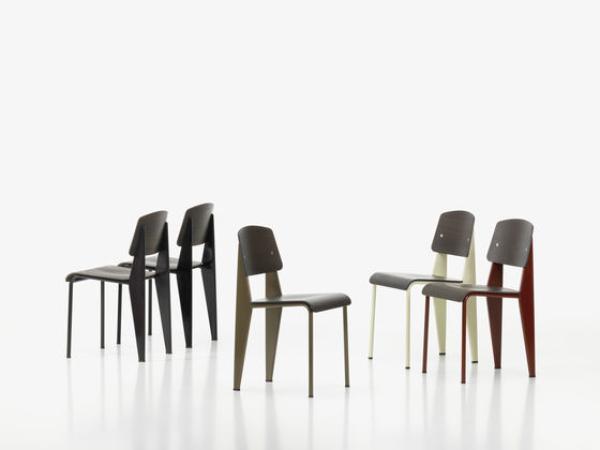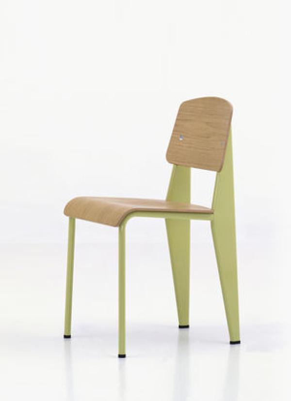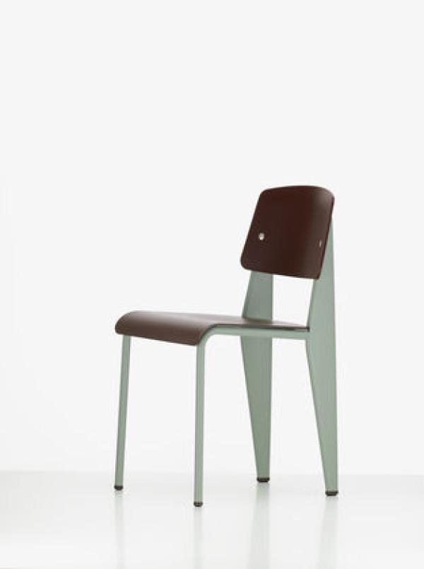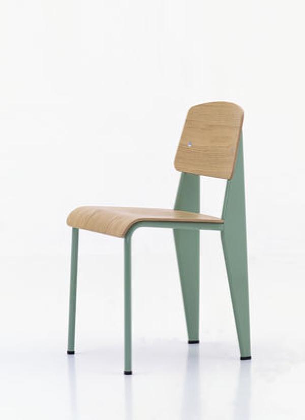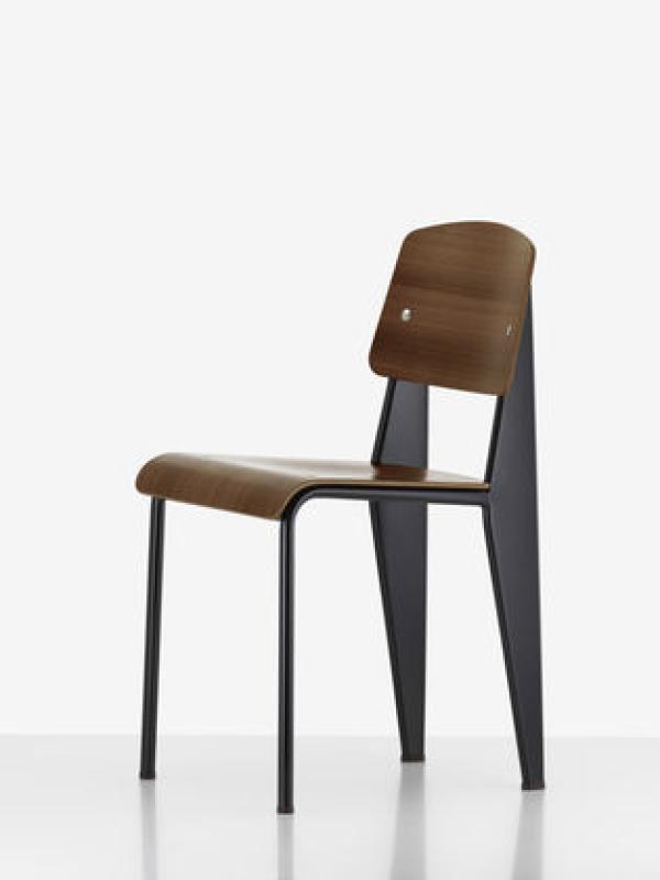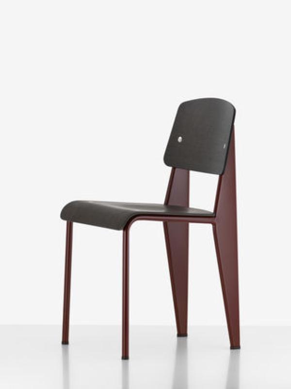 StandardChairs take the most strain on their back legs, where they bear the weight of their user's upper body. Prouvé took this into account very succinctly in Standard Chair. Tubular steel piping is enough for the front legs that take relatively little strain, whereas the back legs are made of voluminous hollow sections and pass the strain on to the floor. Powder-coated sheet steel and round steel frame. Seat and backrest in untreated oak or oak with dark stain, varnished for natural wood effect.