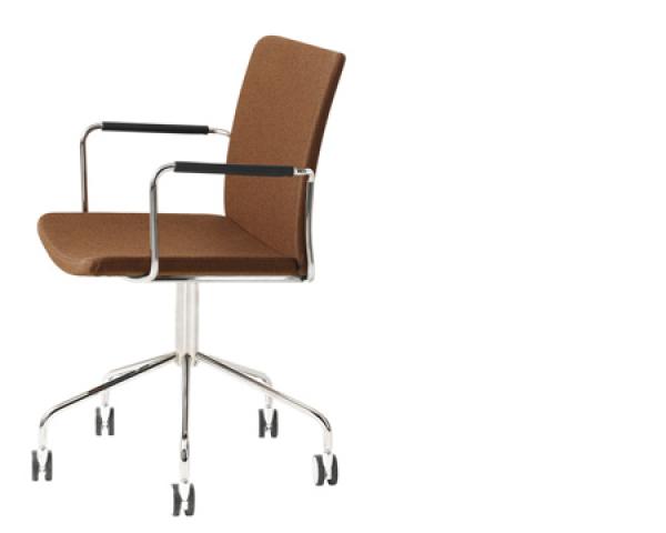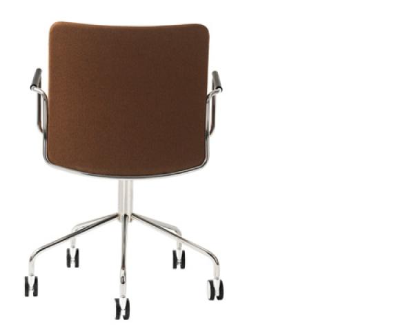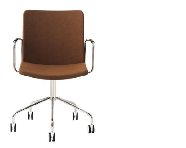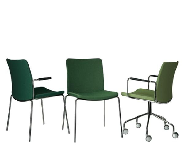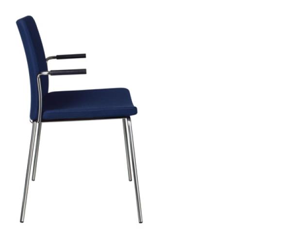 "Stackable upholstered chair, stackable upholstered armchair, stackable upholstered armchair with closed armrest, upholstered armchair with closed armrest and wheel base.
