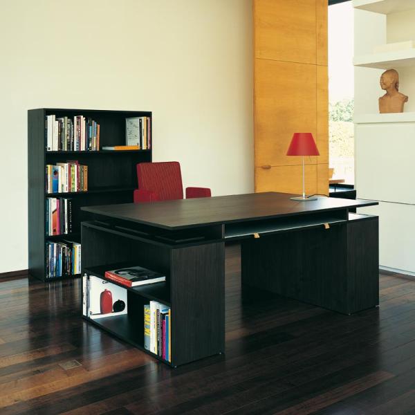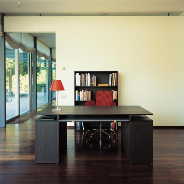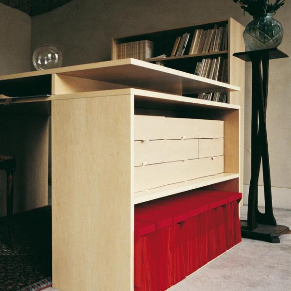Studiolo"The notion Studiolo is common in the Italian renaissance period, it consists of a writing table and a seat shaped like a throne. A studiolo may take different forms, adapted to the user’s needs and job function. The Studiolo concept by Annabelle d’Huart is inspired by Liberatore’s painting the Annunciation in the Pinacoteca in Perugia. Maria is pictured between a writing desk and a seat in the form of a throne. Studio is large yet compact. The simplicity of its functional lines are uninterrupted. Two tops, two shelve units serving as support with a bookcase replacing the throne, give the ability to fill the office space according to the individual needs. Dimensions in mm: