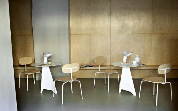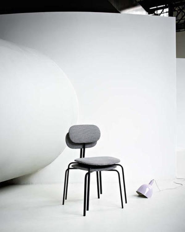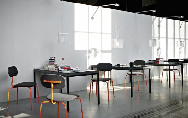 The T-Chair is made of a thin rectangular iron frame that is curved and painted. Secured onto the frame are then the seat and backrest, made of wood or upholstered with sartorially elegant fabrics. Straightforward, versatile and stylish, it fits in with a variety of settings, from household interiors to public spaces, also because it is easily stackable.