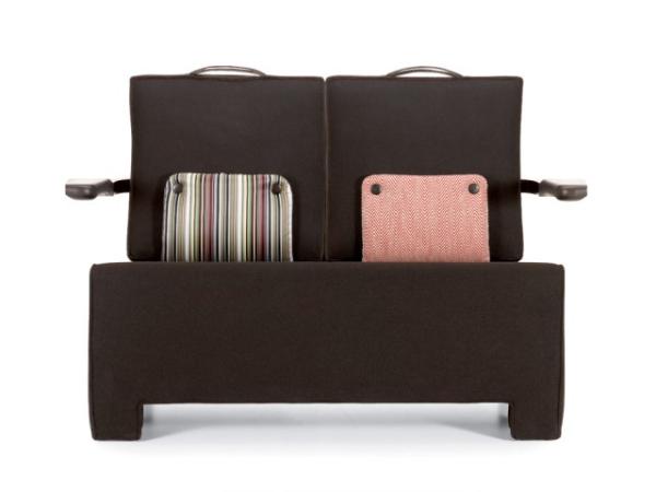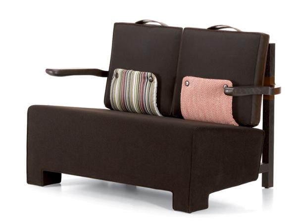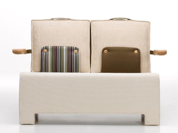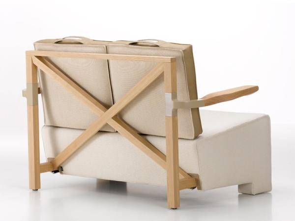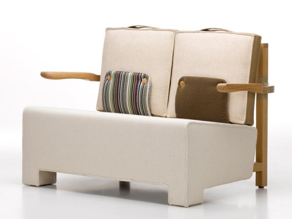The Worker SofaThe Worker Sofa was created by Hella Jongerius primarily as a communicative piece of furniture that would be well suited to the kitchen, conservatory or reading room. Due to its compact dimensions, comfort and the light-hearted detailing that is typical of Jongerius’ work, the Worker Sofa also makes a good impression in the living room or lounge environment. Like the Worker Chair, the sofa combines the qualities of traditional craftsmanship with modern construction methods and a subtle, sophisticated mix of materials. Materials: Solid oak frame and armrests, cast aluminium armrest bridge; seat and lumbar cushions: polyurethane foam and polyester batting, backrest cushion: chamber cushion with microfibre filling.