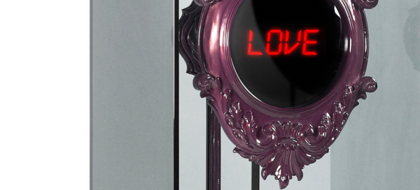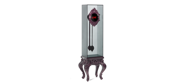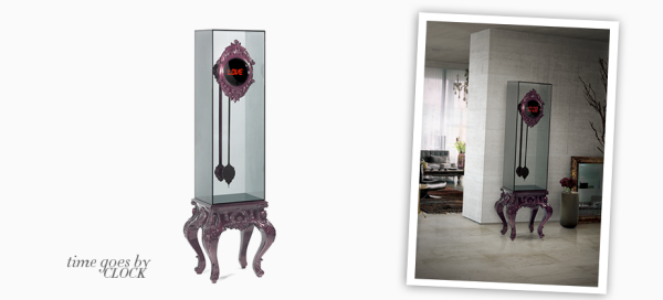Time goes byNovel yet with a classic appeal this piece is a dynamic twist on the time-honored grandfather clock. A handcarved mahogany framed digital clock with a cut stainless steel pendulum is encased in a smoked glass box supported by an ornate handcarved mahogany base covered in silver leaf and finished with a combination of high gloss amethyst and smoked black translucent varnish. Dimensions : WIDTH 630 x DEPTH 510 x HEIGHT 2030mm |
