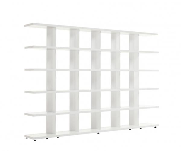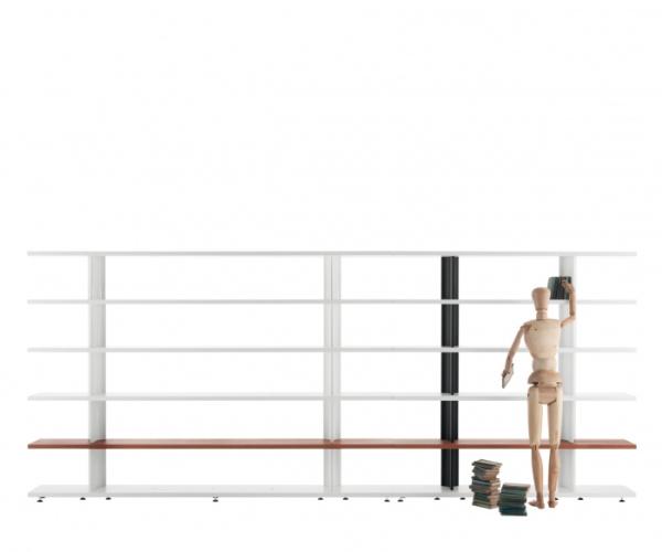 TokModular bookcase based on a vertical element made of painted or unfinished extruded aluminium, available in two heights, wooden shelves in blockboard in MDF lacquered, laminated, veneer or unfinished, available in five dimensions, bases in black painted steel with adjustable feet. The assembly of the system is based on the vertical element, connected to the shelves through the hardware that comes with it, with a simple hex key. Back panels, wall and ceiling fastening kits, vertical elements with base, are also available as accessories.